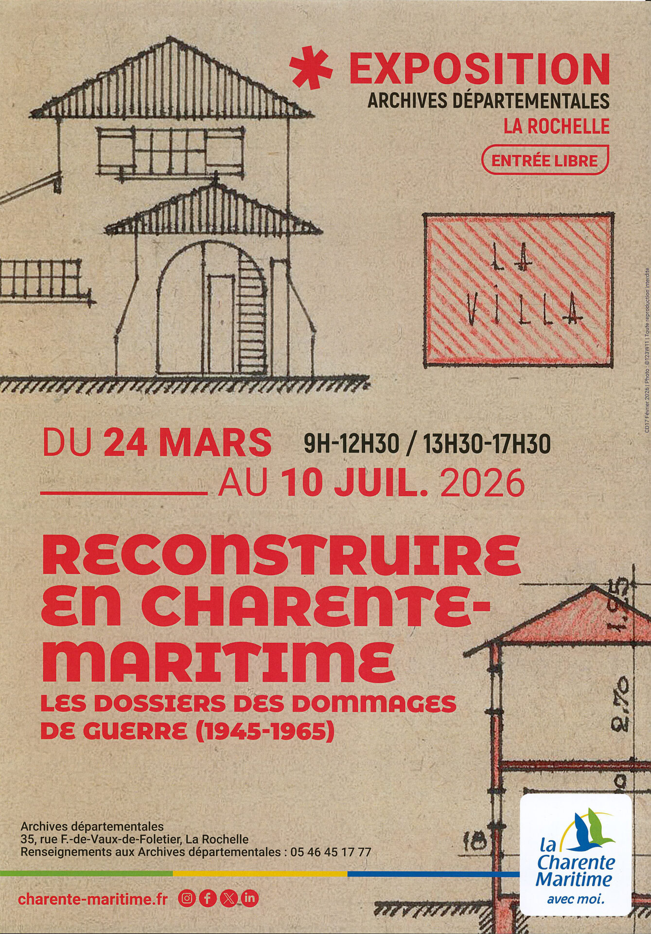 La Charente-Maritime, à l’échelle de la Région Nouvelle-Aquitaine, a été le département le plus touché par les destructions de la Seconde Guerre mondiale. Après le 8 mai 1945 s’ouvre la Reconstruction. Pour marquer les 80 ans du début d’une nouvelle ère, les Archives départementales proposent une nouvelle exposition Reconstruire en Charente-Maritime : les dossiers des dommages de guerre (1945-1965).